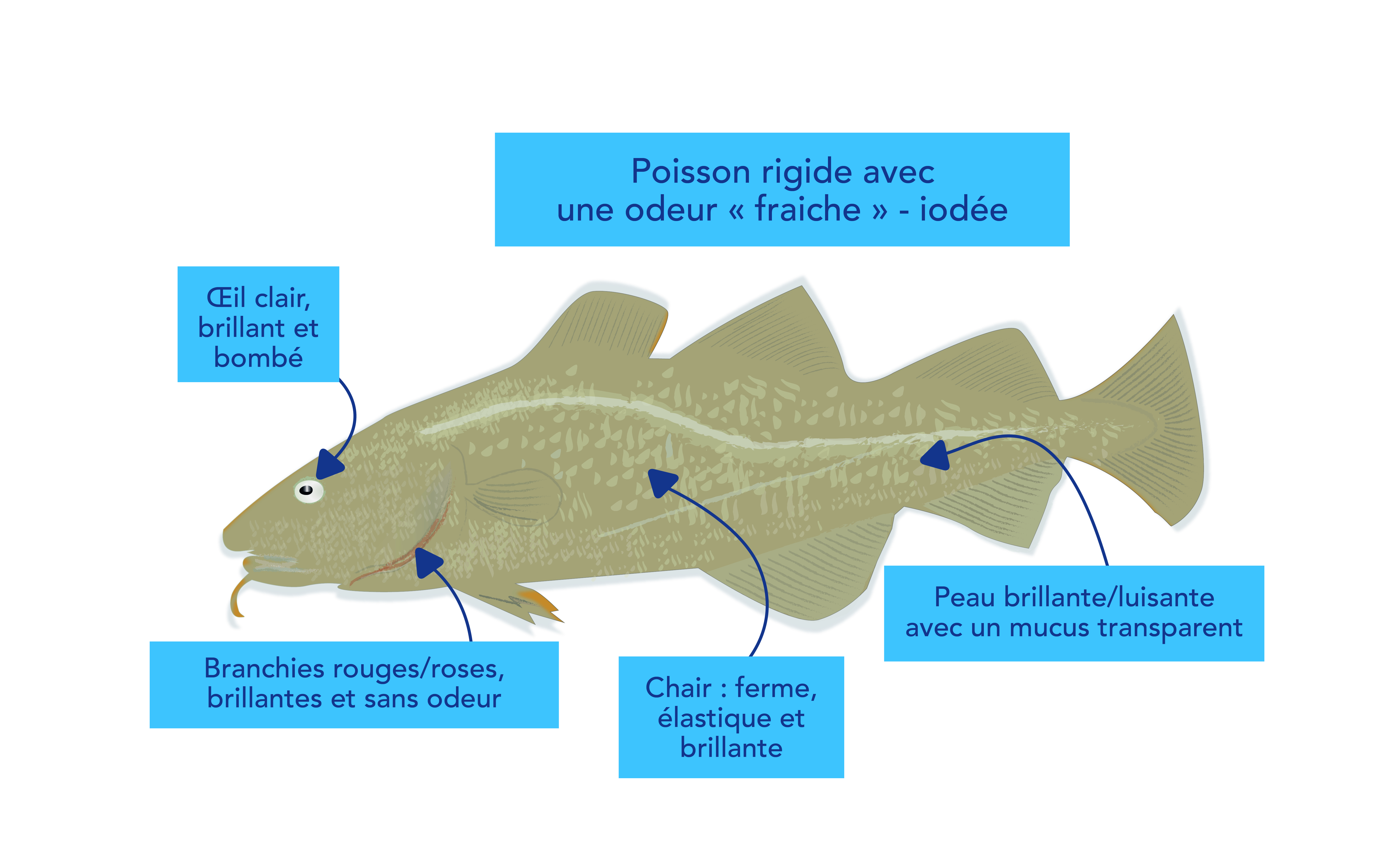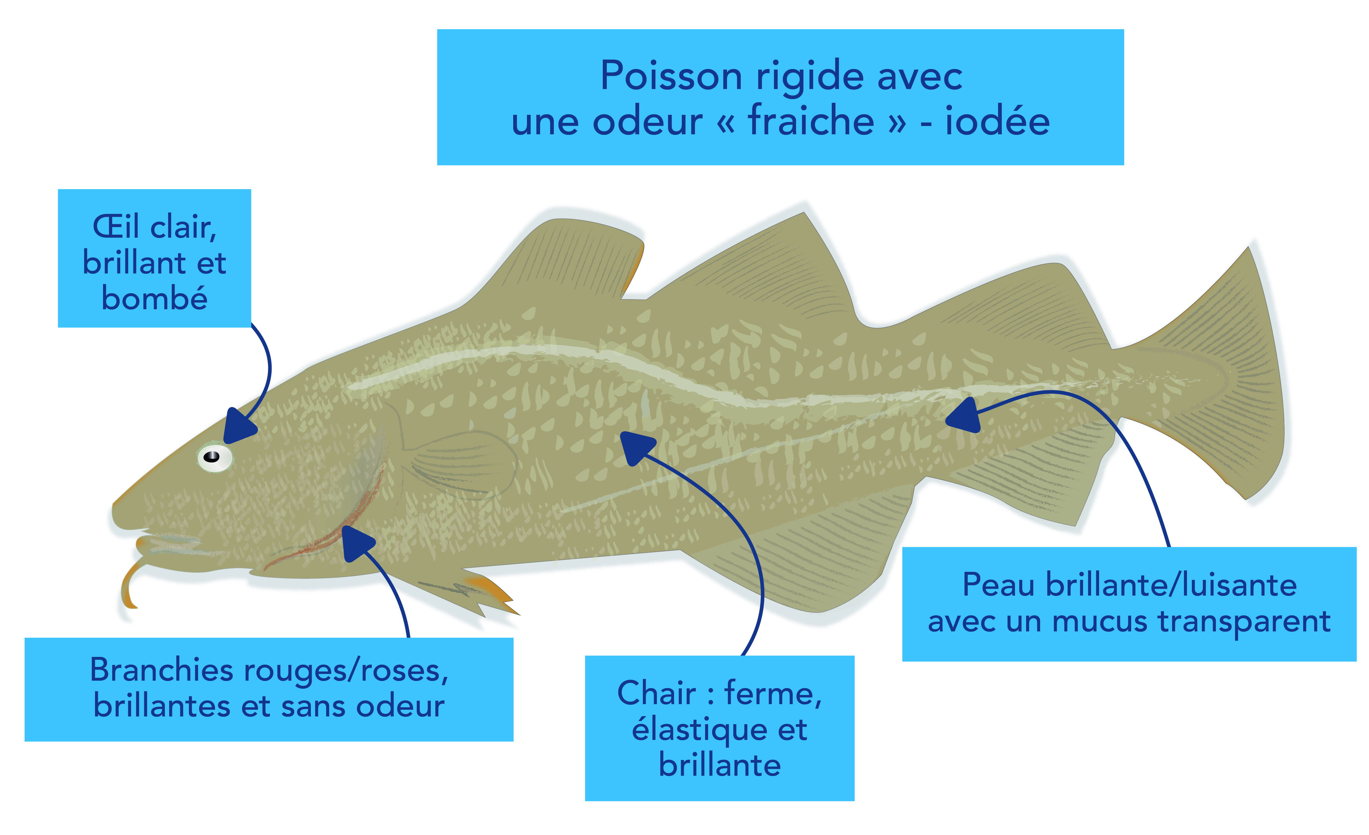 Pour reconnaître un poisson frais, différents critères sont utiles pour déterminer la fraîcheur d’un poisson : la peau brillante, les yeux brillants et bombés, les branchies rouges, la chair ferme et l’odeur d’iode. Et oui, saviez-vous qu’un poisson frais est un poisson qui ne sent pas ?! Il a seulement une odeur iodée, comme les algues !