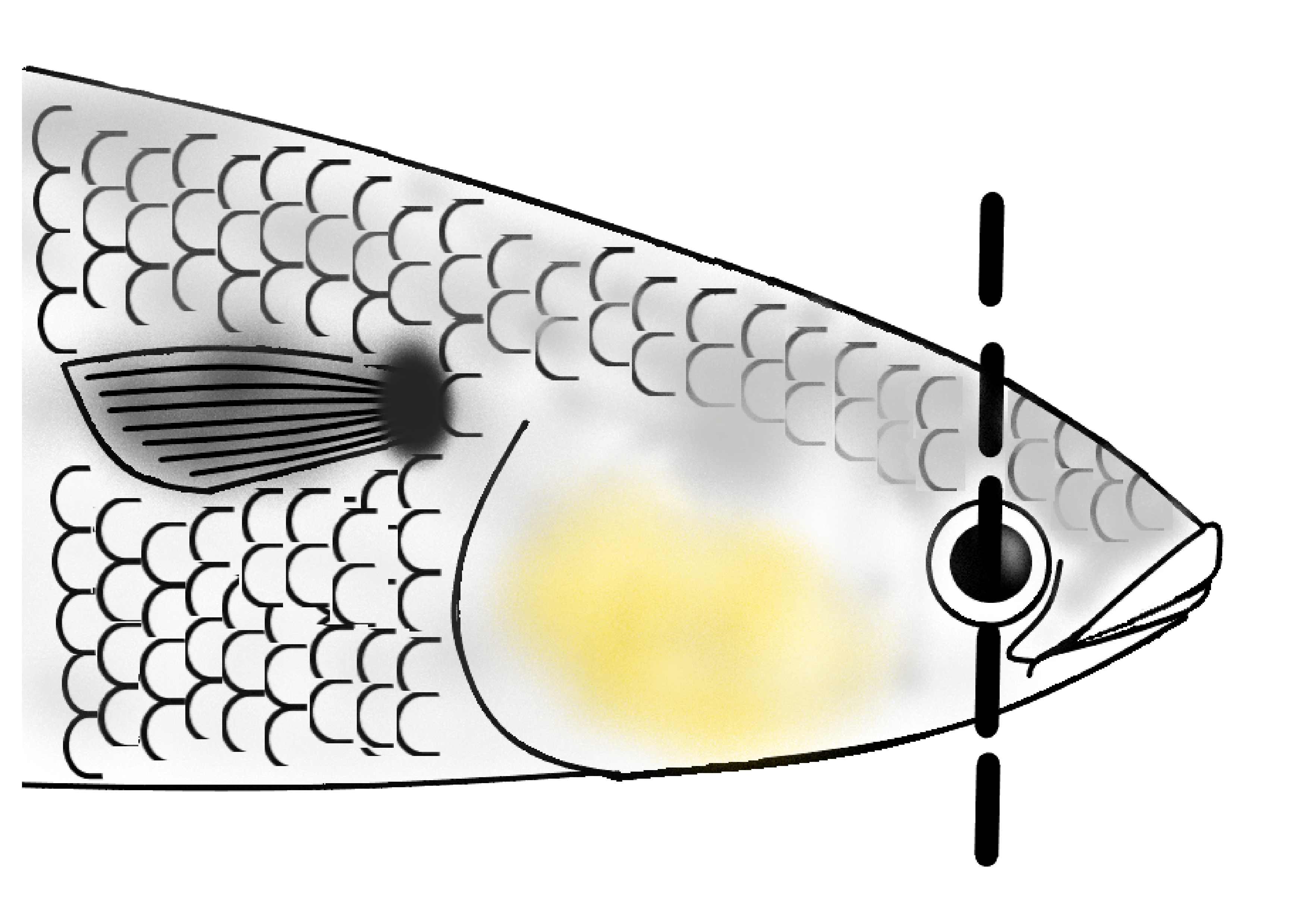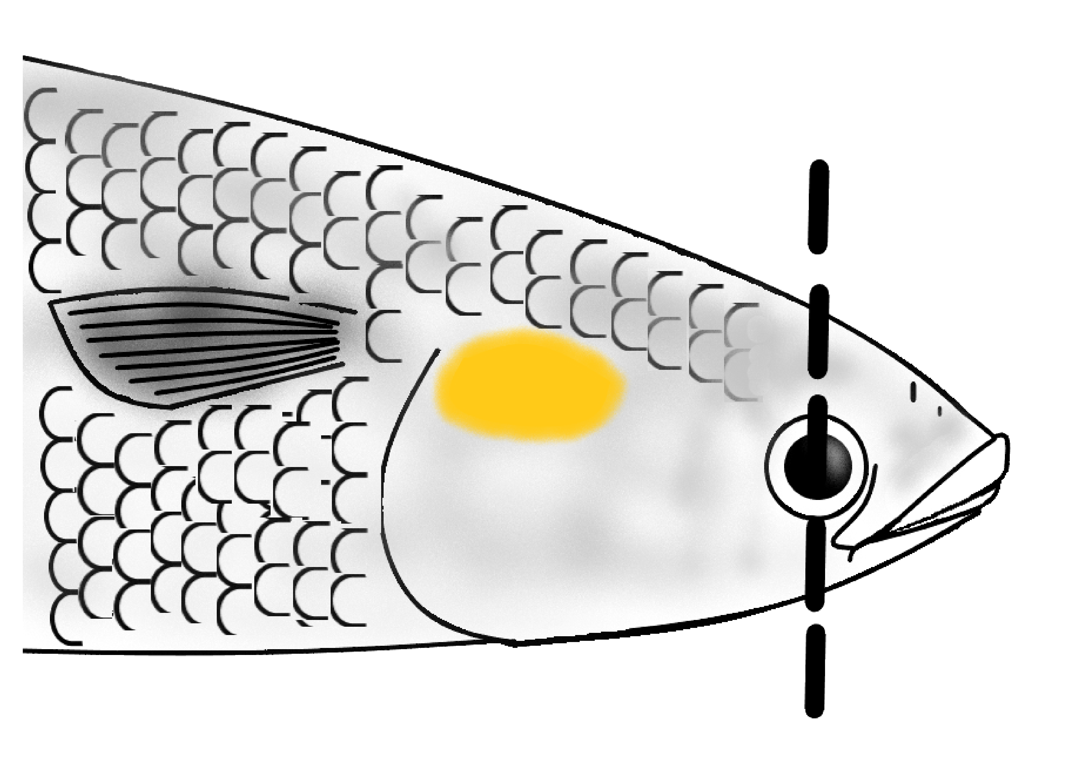 L’absence d’écailles au niveau du museau, des orbites circulaires et des taches nettes et dorées sur les opercules permettent d’identifier le mulet doré.