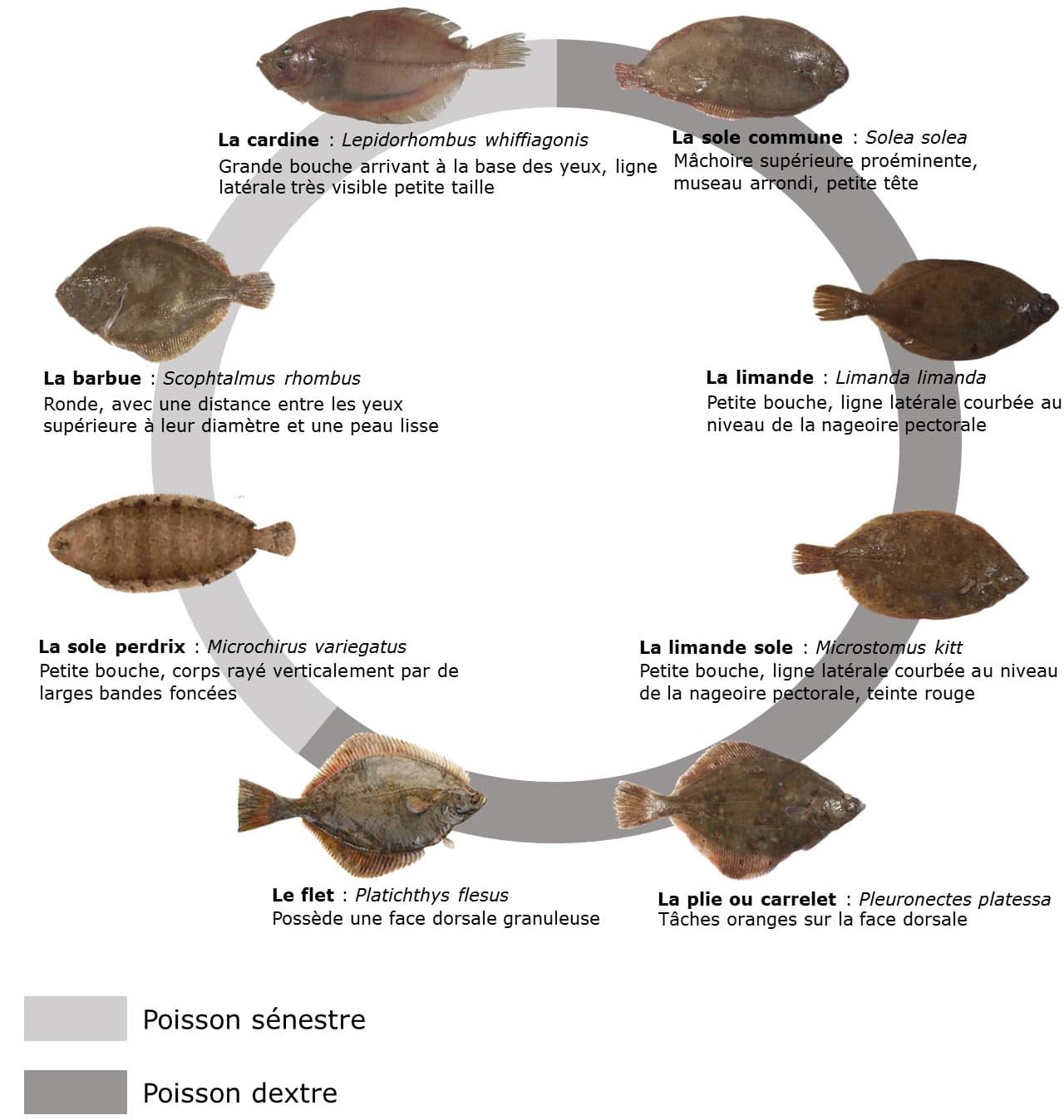 A leur naissance, les alevins de poissons plats n’ont rien de plat ! La larve a un aspect normal avec un œil sur chacun de ses côtés. Au cours de la croissance de la larve, un œil et une narine vont migrer sur la même face que les autres, ce qui donnera la future face dorsale. Les yeux vont soit se retrouver du côté droit : ce qui donnera les poissons plats à symétrie dextre (plie, sole par exemple) soit du côté gauche : ce qui donnera les poissons plats à symétrie senestre (barbue, cardine par exemple)
